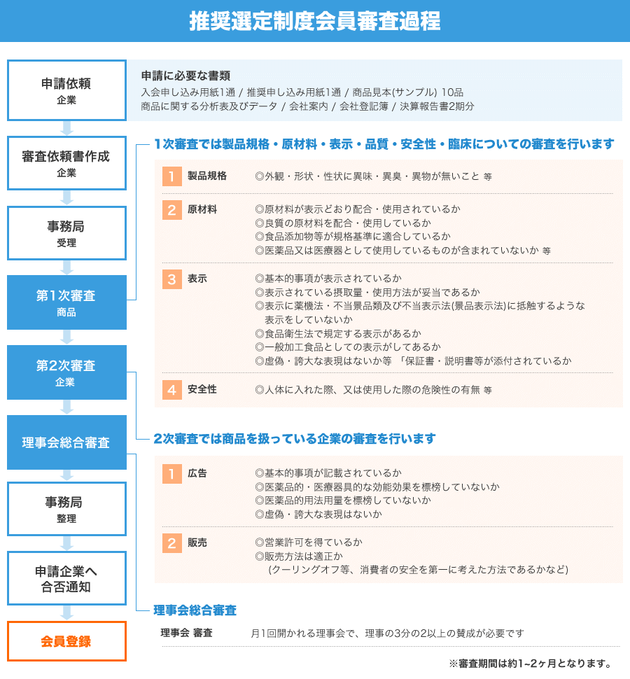 推奨選定制度は、商品の品質、安全性について審査をし、消費者が安心して商品を使用するための指標となり、「商品の健全化」・「人の健全化」・「企業の健全化」を通して商品の売り上げ向上を目指していく制度で、正会員のみが受けることができるサービスです。